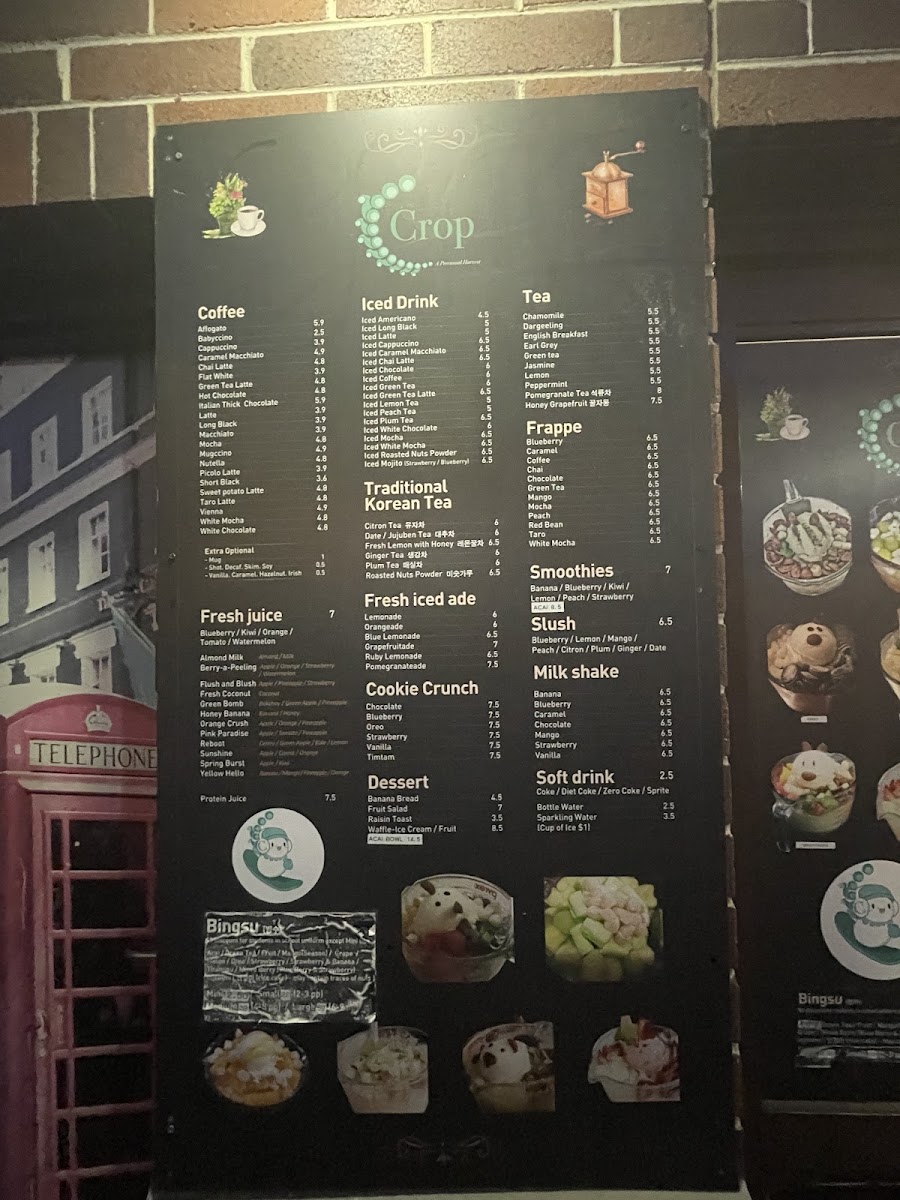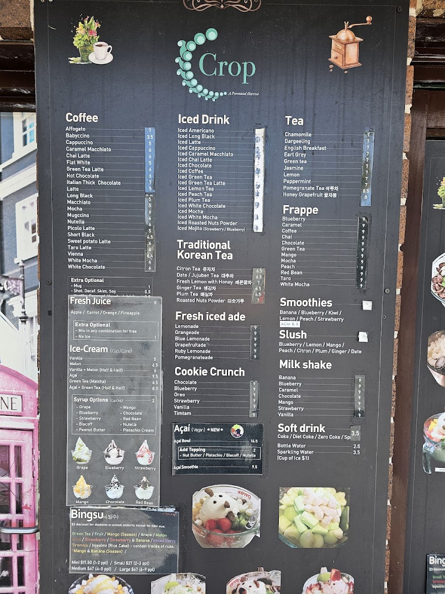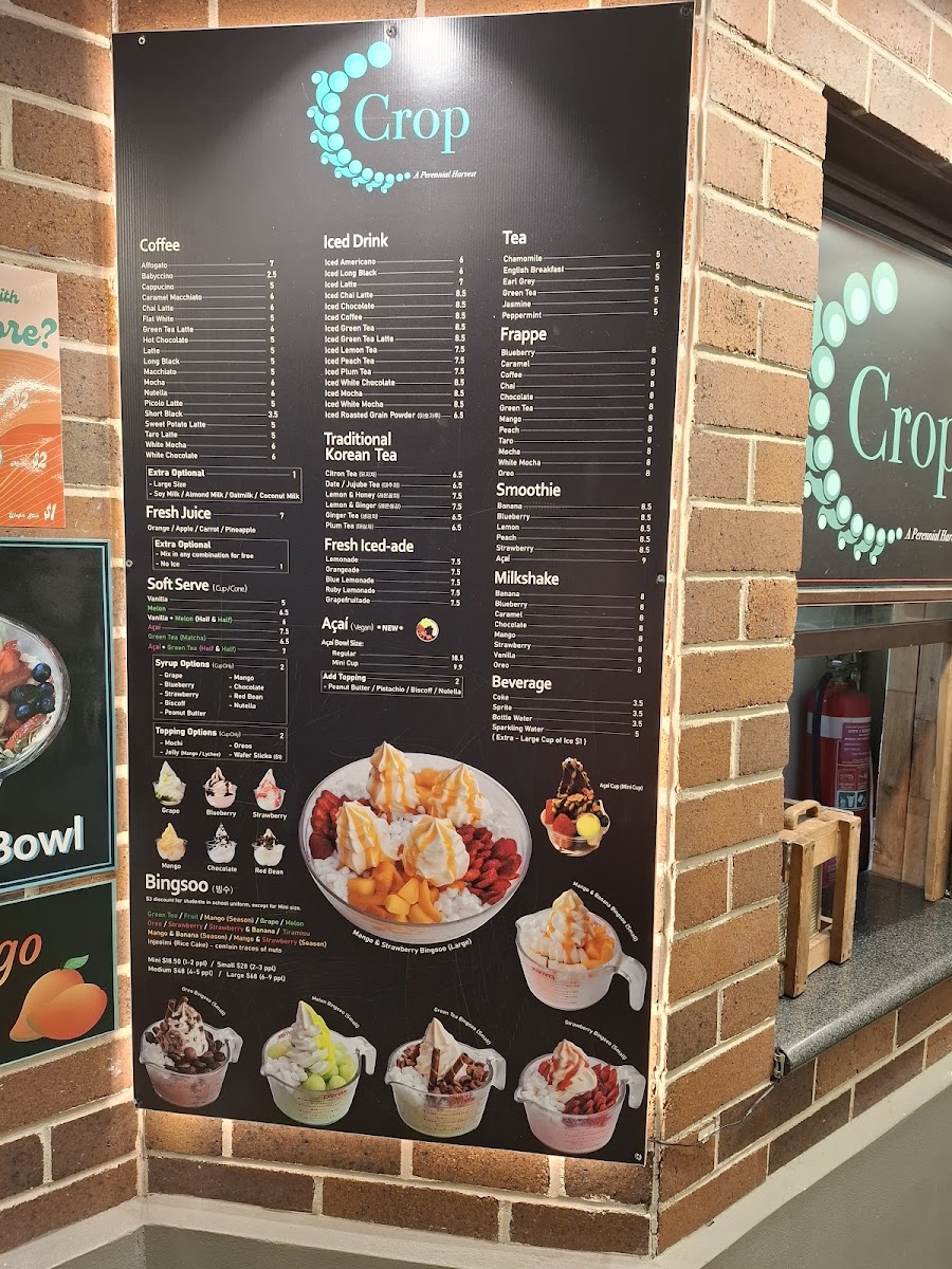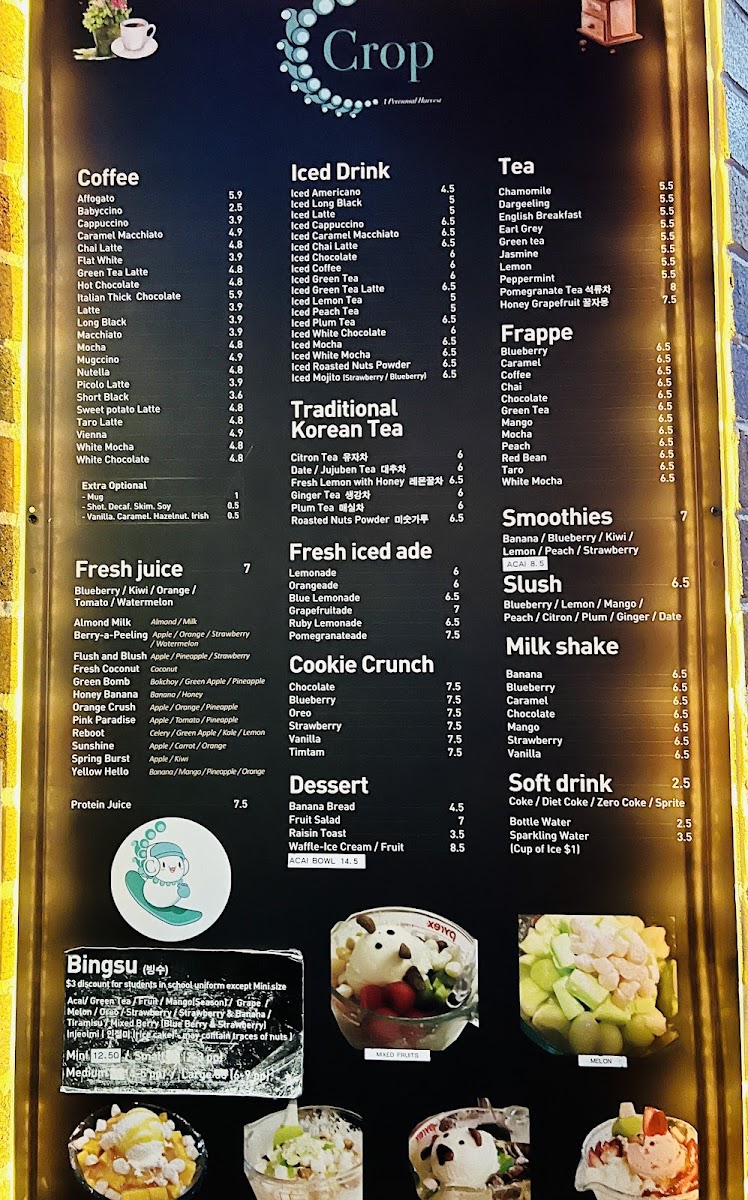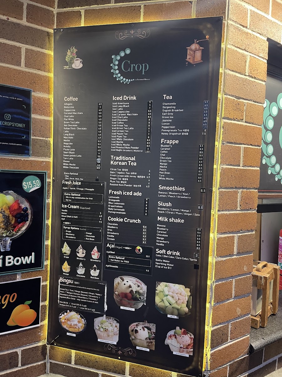 The menu at Café Crop Strathfield offers a wide array of drinks and treats perfect for any occasion. For coffee lovers, options like Affogato and Caramel Macchiato are available, alongside comforting choices like Cappuccino and Chai Latte. If you're in the mood for something cold, the iced drinks section features refreshing picks such as Iced Americano and Iced Latte, with exciting variations like Iced Chai Latte and Iced Chocolate. The frappe options, including Blueberry and Caramel, offer a cool, indulgent experience. Health-conscious patrons can enjoy Banana, Kiwi, and Strawberry smoothies, or perhaps a creamy Milk Shake in flavors like Banana, Chocolate, and Mango. For something unique, the traditional Korean teas like Citron Tea and Fresh Lemon with Honey provide a soothing, exotic twist. If you're looking for a refreshing pick-me-up, the Fresh Iced Ade options such as Lemonade and Grapefruitade are perfect. For a sweet treat, the Cookie Crunch varieties like Oreo and Blueberry complement the drink offerings. Additionally, there's a selection of slush, including Blueberry, and soft drinks such as Coke and Sparkling Water. Tea enthusiasts can enjoy a relaxing cup of Chamomile, Earl Grey, or Green Tea, while those with a sweet tooth can try indulgent flavors like Chocolate and Vanilla. Whether you're craving a refreshing iced drink or a comforting hot tea, Café Crop's diverse menu has something to satisfy every taste.