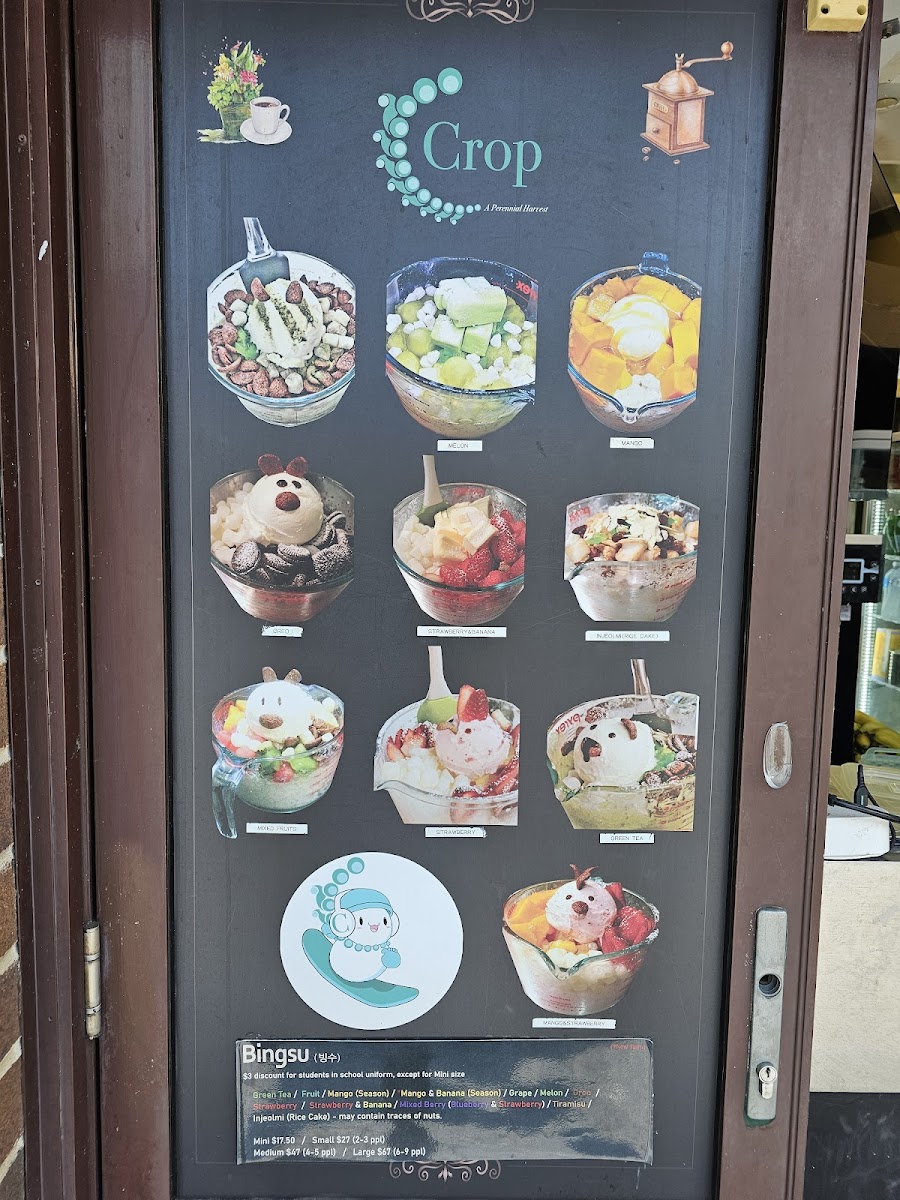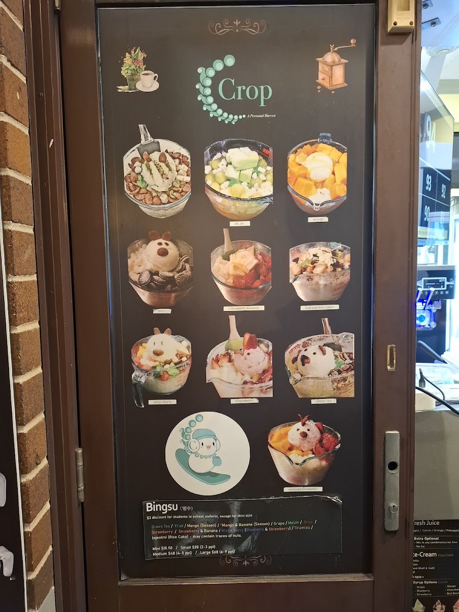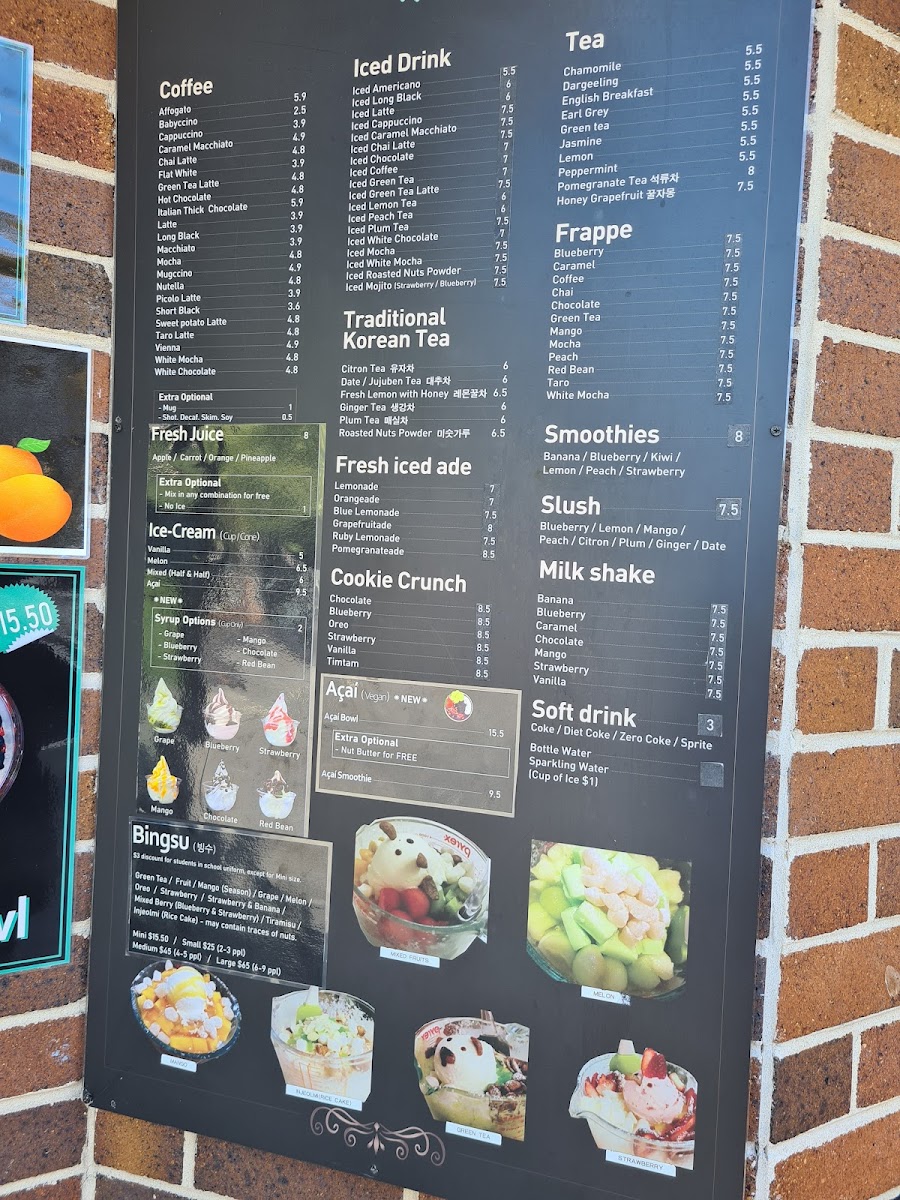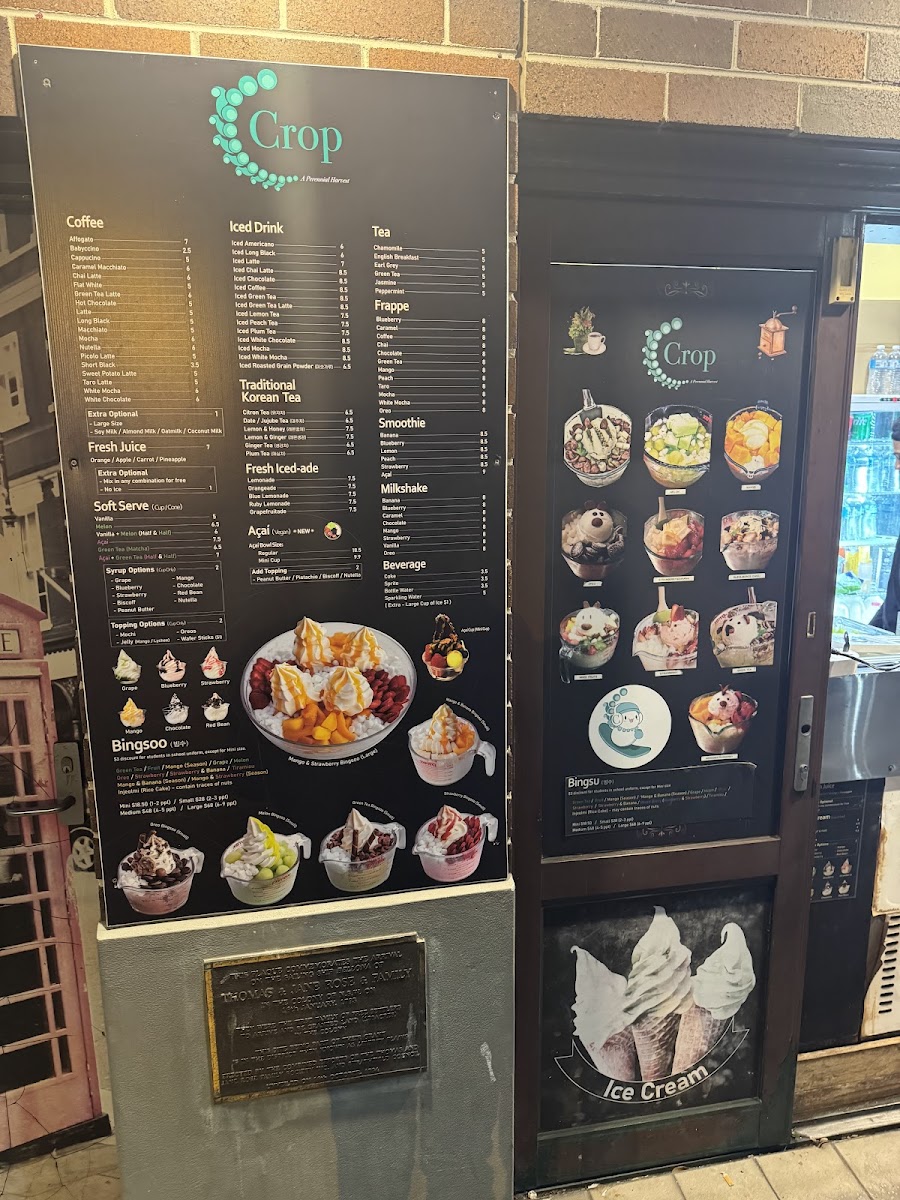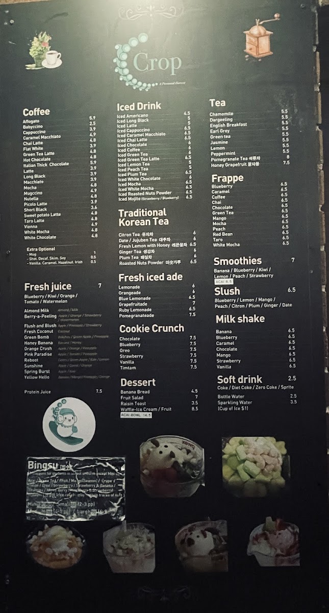 The menu at Café Crop Strathfield offers a wide array of drinks and treats perfect for any occasion. For coffee lovers, options like Affogato and Caramel Macchiato are available, alongside comforting choices like Cappuccino and Chai Latte. If you're in the mood for something cold, the iced drinks section features refreshing picks such as Iced Americano and Iced Latte, with exciting variations like Iced Chai Latte and Iced Chocolate. The frappe options, including Blueberry and Caramel, offer a cool, indulgent experience. Health-conscious patrons can enjoy Banana, Kiwi, and Strawberry smoothies, or perhaps a creamy Milk Shake in flavors like Banana, Chocolate, and Mango. For something unique, the traditional Korean teas like Citron Tea and Fresh Lemon with Honey provide a soothing, exotic twist. If you're looking for a refreshing pick-me-up, the Fresh Iced Ade options such as Lemonade and Grapefruitade are perfect. For a sweet treat, the Cookie Crunch varieties like Oreo and Blueberry complement the drink offerings. Additionally, there's a selection of slush, including Blueberry, and soft drinks such as Coke and Sparkling Water. Tea enthusiasts can enjoy a relaxing cup of Chamomile, Earl Grey, or Green Tea, while those with a sweet tooth can try indulgent flavors like Chocolate and Vanilla. Whether you're craving a refreshing iced drink or a comforting hot tea, Café Crop's diverse menu has something to satisfy every taste.
